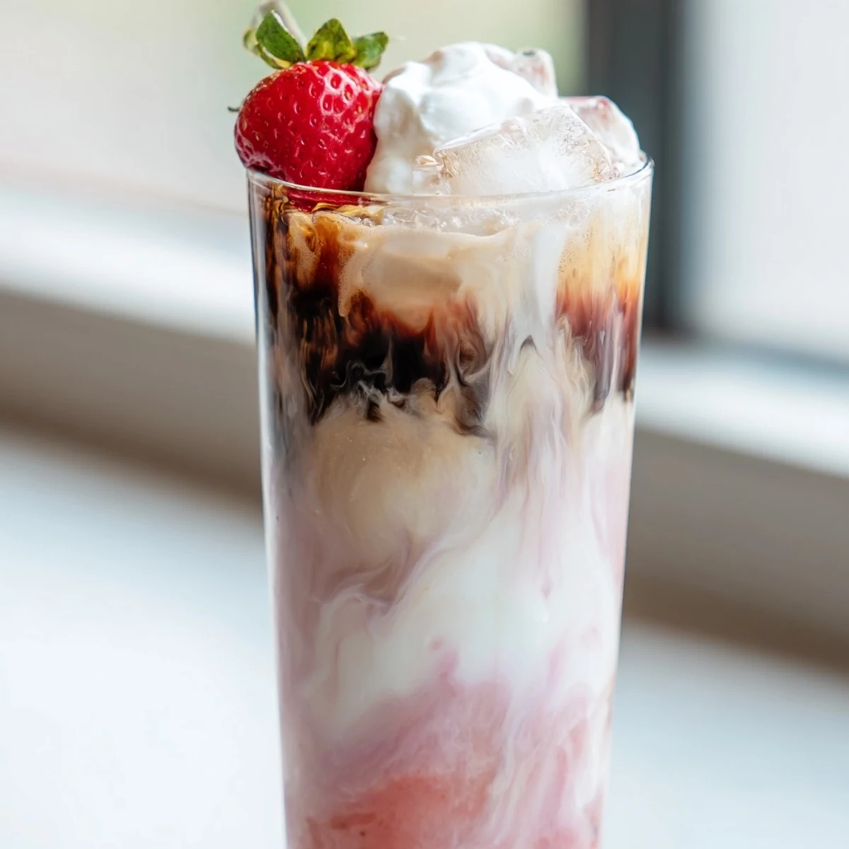 Pour the strawberry cream mixture over the ice first, then slowly pour the cold coffee over the back of a spoon held just above the liquid surface. This gentle pouring technique creates beautiful layered swirls rather than immediate mixing, giving you that stunning marbled presentation.