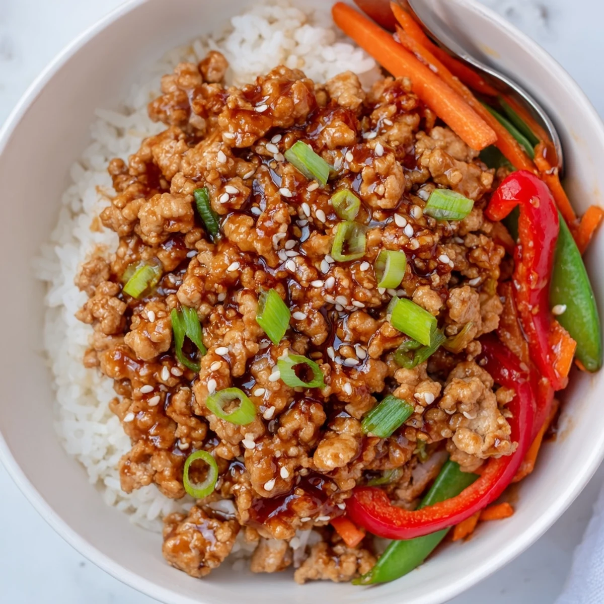 Bright, savory bowls of teriyaki-glazed ground turkey served over fluffy jasmine rice with crisp carrots, bell pepper and snap peas. Rinse and simmer rice while you brown turkey, then sauté garlic and ginger with vegetables until just tender. Whisk soy, honey, rice vinegar and a cornstarch slurry, toss with turkey and veggies until glossy and thickened. Ready in about 35 minutes for four servings; garnish with sesame and green onions.